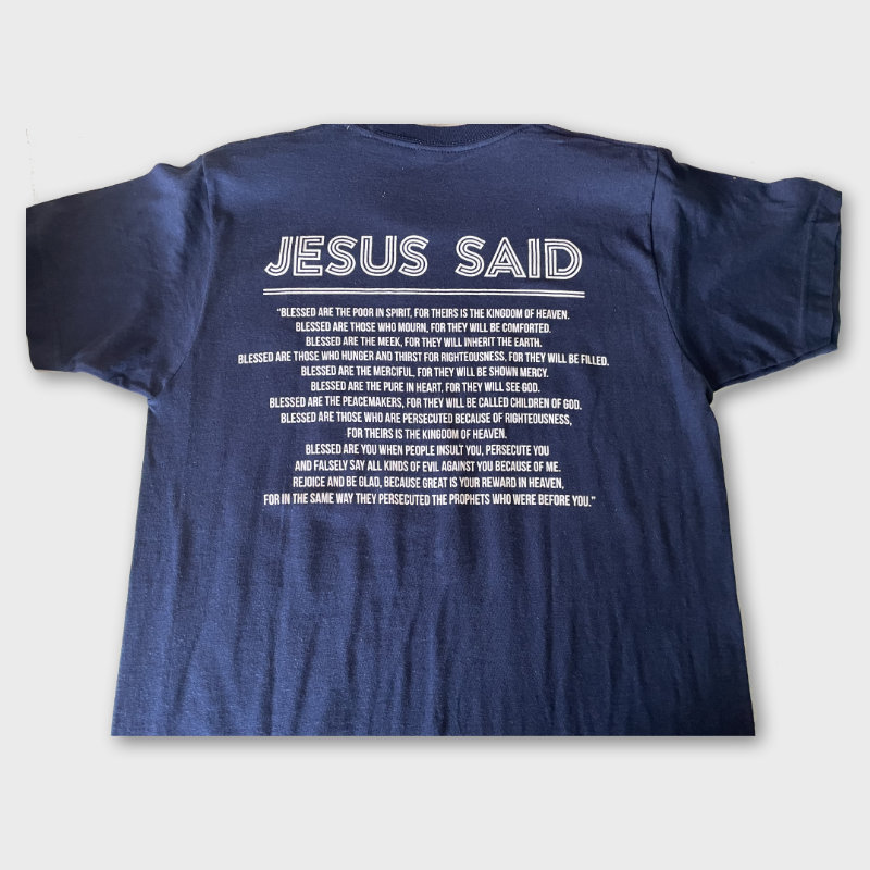 A blue t-shirt with the words “Blessed Are” on the front. On the back is the text of the Beatitudes from Matthew 5.