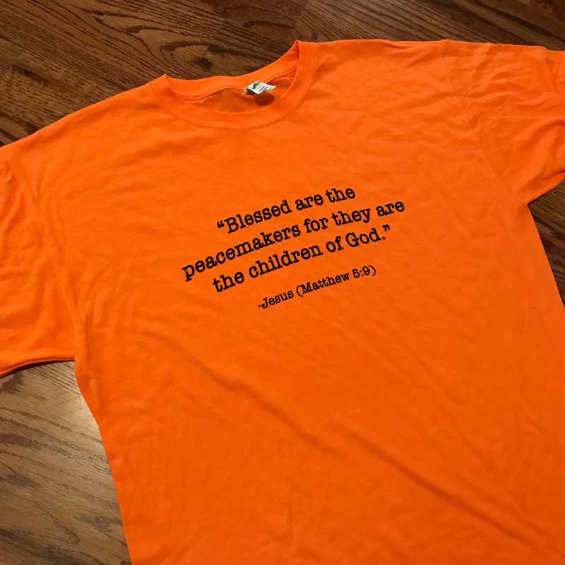 Orange shirt with the words of Jesus from Matthew 5:9 in black: “Blessed are the peacemakers for they are the children of God.”