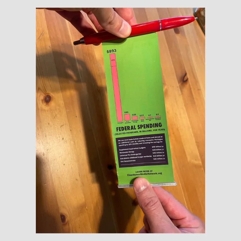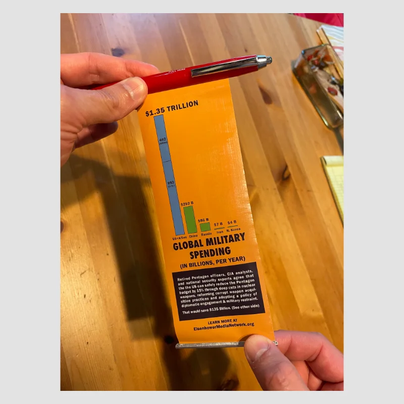 This is no ordinary pen. It’s a peace pen and a great conversation-starter. Our friend Ben Cohen designed it (Ben is the ice cream man and co-founder of Ben & Jerry’s… and one of the first folks we chopped up guns with!). Each pen has a pull-out flap that shows how much money the US spends on the military compared to other nations. And when you flip it over you can see how our military budget lines up with other social programs. Get one for some friends, or post a video on the socials (and tag us!). Use it to talk with people about building a better world!