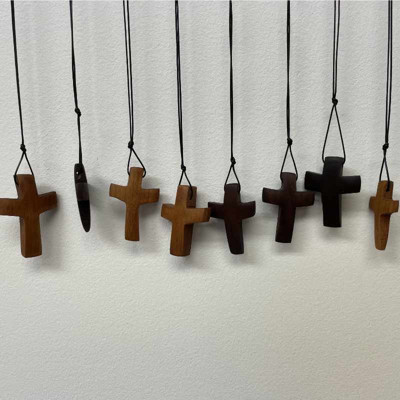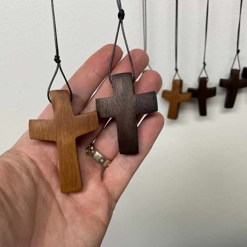These crosses are made from small parts of gun stocks that cannot be made into tool handles. They average 2″ height and 1″ width and vary from dark to light wooden color. Limited stock available.